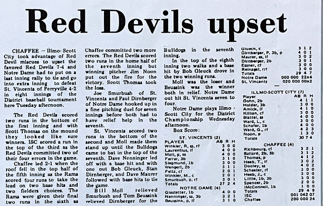 Scott and I had a previous history competing. In an 11–12-year-old All Star game, he hit me with a pitch on the hand. My best effort to tough it out failed, I cried. Then in this past year's football matchup, I blocked one of his punts that left a bruise and the imprint of the laces of the football for a couple of weeks. Today, however, I hit him. More accurately it was a bloop over the shortstop's head that contributed to our unexpected victory after falling behind in the first inning. The newspaper article even said that the 2-run lead made Chaffee look like 'sure winners' with Thomas on the mound. Taking advantage of some Red Devil miscues in the field, we built a big enough lead to withstand their 7th inning rally.